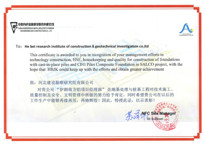 我公司承建的伊朗南方鋁項(xiàng)目,自開工以來精心策劃、有效組織、認(rèn)真施工、積極與業(yè)主配合,保質(zhì)保量完成了施工進(jìn)度。在施工過程中業(yè)主對我公司伊朗南方鋁項(xiàng)目部在技術(shù)施工、質(zhì)量控制及安全、文明管理中所做的努力給予了肯定,并授予表彰證書。