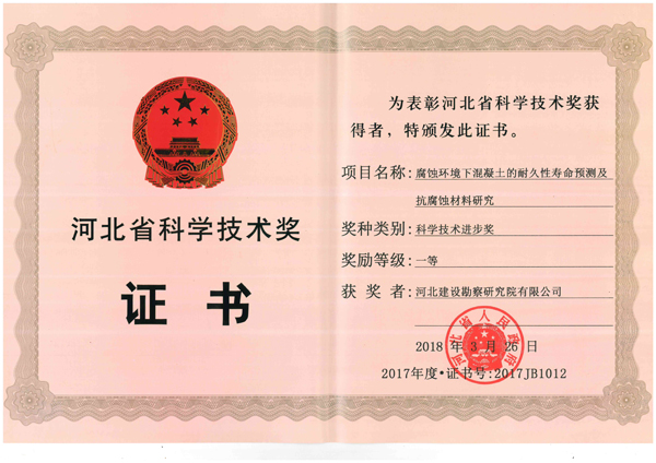 5月30日上午,河北省科學(xué)技術(shù)獎(jiǎng)勵(lì)暨慶祝“全國科技工作者日”大會(huì)在石家莊舉行。省委書記王東峰、省長許勤等省領(lǐng)導(dǎo)出席大會(huì),并為榮獲2017年度河北省科學(xué)技術(shù)獎(jiǎng)勵(lì)代表和第十屆河北省優(yōu)秀科技工作者代表頒發(fā)證書。我公司《腐蝕環(huán)境下混凝土的耐久性壽命預(yù)測(cè)及抗腐蝕材料研究》獲省科技進(jìn)步一等獎(jiǎng)、《素混凝土剛性樁復(fù)合地基核心技術(shù)研究與工程應(yīng)用》獲三等獎(jiǎng),聶慶科總工程師代表公司參加了大會(huì)并上臺(tái)領(lǐng)獎(jiǎng)。這是我公司繼2014、2015年度后再獲河北省科技進(jìn)步一等獎(jiǎng),對(duì)我們既是極大鼓舞和肯定,也必將激勵(lì)和鞭策廣大專業(yè)技術(shù)人員,以黨的十九大精神和習(xí)總書記在兩院院士大會(huì)講話精神為指引,積極投身創(chuàng)新實(shí)踐,大力開展科研攻關(guān),為不斷推進(jìn)巖土工程技術(shù)發(fā)展、提升企業(yè)創(chuàng)新能力和核心競(jìng)爭(zhēng)力而繼續(xù)努力奮斗。
