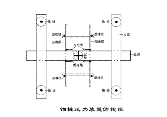 錨樁反力裝置就是將被測(cè)樁周圍對(duì)稱的幾根錨樁用錨筋與反力架連接起來(lái),依靠樁頂?shù)那Ы镯攲⒎戳茼斊穑杀贿B接的錨樁提供反力,提供反力的大小由錨樁數(shù)量,反力架強(qiáng)度和被連接錨樁的抗拔力決定。錨樁反力裝置一般不會(huì)受現(xiàn)場(chǎng)條件和加載噸位數(shù)的限制,當(dāng)條件允許,采用工程樁作錨樁是最經(jīng)濟(jì)的。