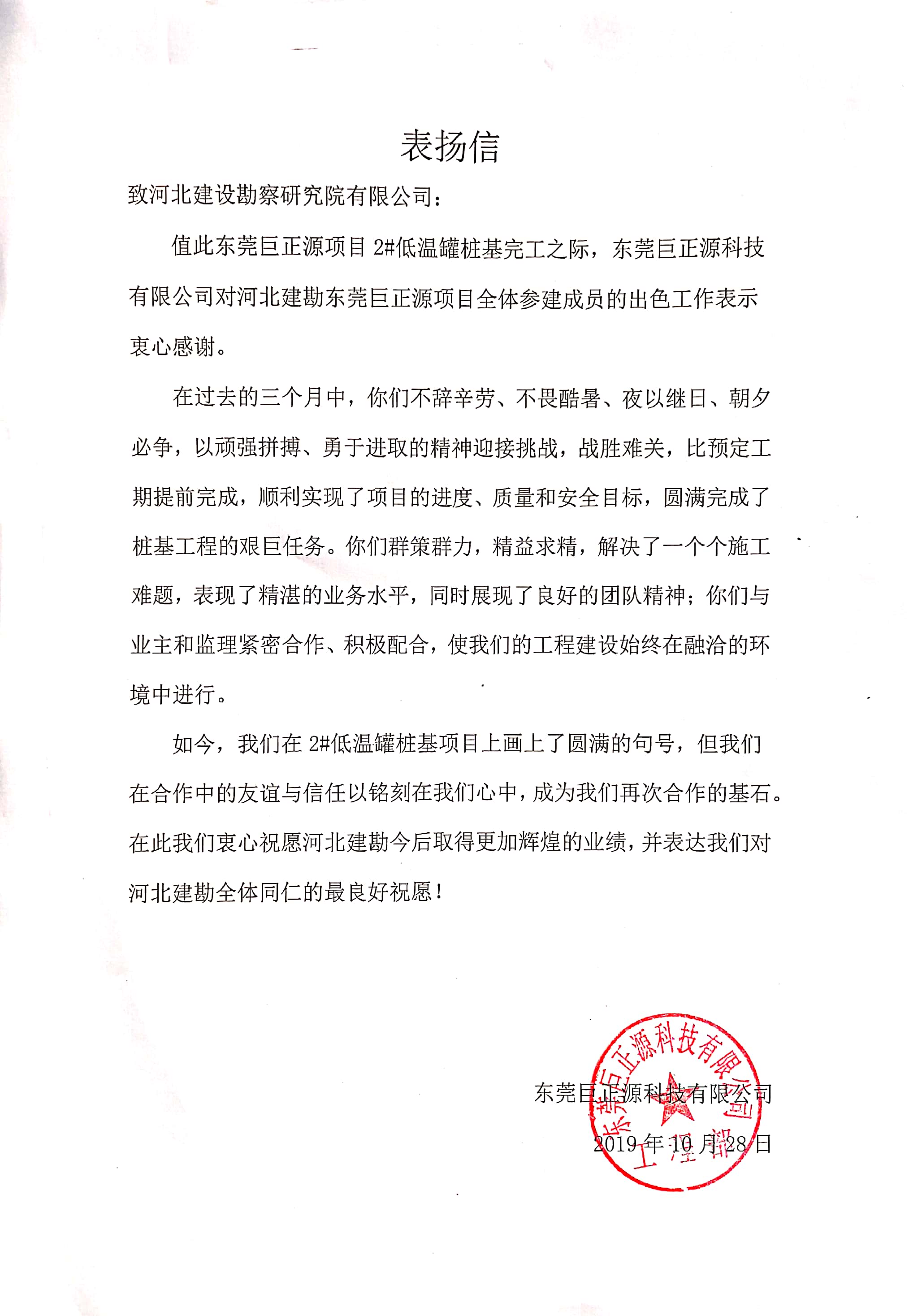 我公司承建的東莞巨正源120萬噸/年丙烷脫氫制高性能聚丙烯項(xiàng)目一期2#低溫丙烷儲(chǔ)罐樁基及短柱工程,在施工過程中全體員工不畏酷暑,夜以繼日,戰(zhàn)勝難關(guān),保證了工程安全和質(zhì)量,得到了業(yè)主和監(jiān)理的一致好評(píng),已圓滿完成各項(xiàng)施工任務(wù),順利完工。