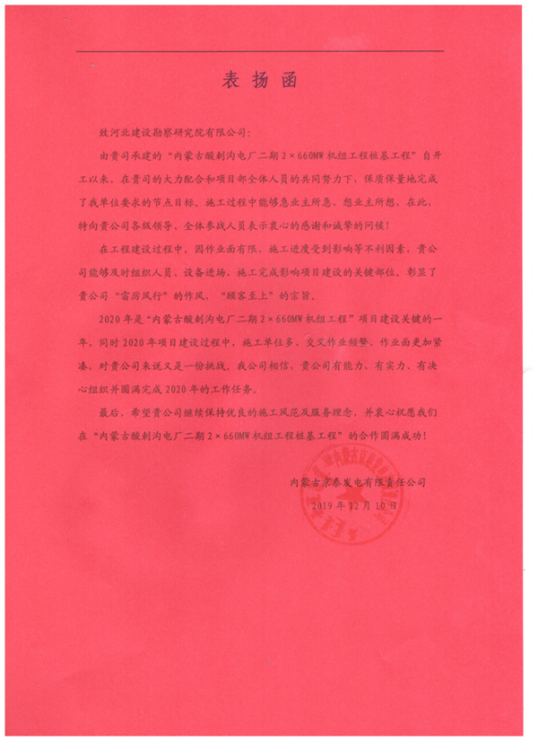 近日,由我公司承建的內蒙古酸刺溝二期2×660WM機組工程樁基工程收到甲方內蒙古京泰發電有限公司的表揚信,對項目部全體員工的辛勤付出,給予了高度認可和評價,并為后續雙方的合作奠定了良好基礎。這充分彰顯了河北建勘人“雷厲風行”的作風,“顧客至上”的宗旨。我們將繼續保持我們的施工風范和服務理念,再接再厲,圓滿完成后續施工任務!