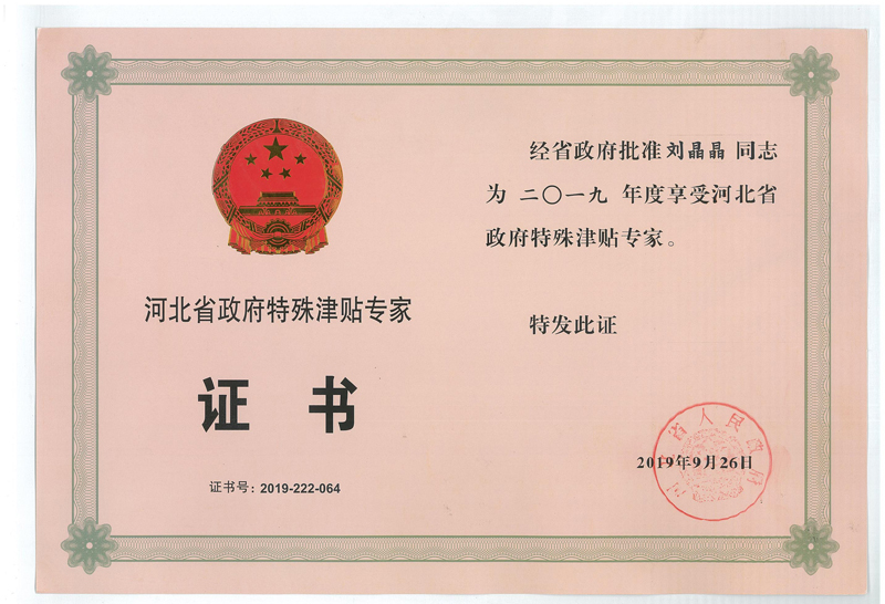 公司劉晶晶同志榮獲2019年度河北省政府特殊津貼專家稱號(hào)