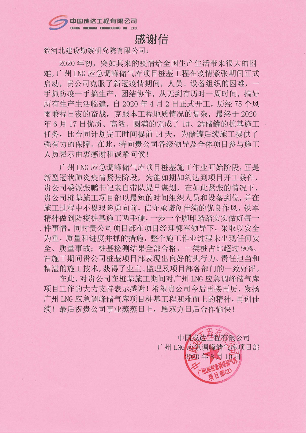 近日,我公司廣州LNG應(yīng)急調(diào)峰儲氣庫項目收到成達公司發(fā)放的感謝信。廣州LNG應(yīng)急調(diào)峰項目是我公司首次在LNG行業(yè)打入廣州市場,也是首次和中國成達工程公司進行合作,項目部全體員工發(fā)揚公司的鐵軍精神做到防疫施工兩手硬,不畏艱險勇向前,齊心協(xié)力、積極策劃,圓滿的完成了各項任務(wù),為廣州LNG應(yīng)急調(diào)峰項目順利實施打下良好的基礎(chǔ);在施工中,項目安全生產(chǎn)管理到位,質(zhì)量工藝管控優(yōu)良,贏得了業(yè)主、監(jiān)理及相關(guān)各方高度認可。對全體參建本項目的領(lǐng)導(dǎo)與員工表示了衷心的感謝,并希望在后續(xù)的工程建設(shè)中,繼續(xù)發(fā)揚河北建勘的優(yōu)良工作作風(fēng)!