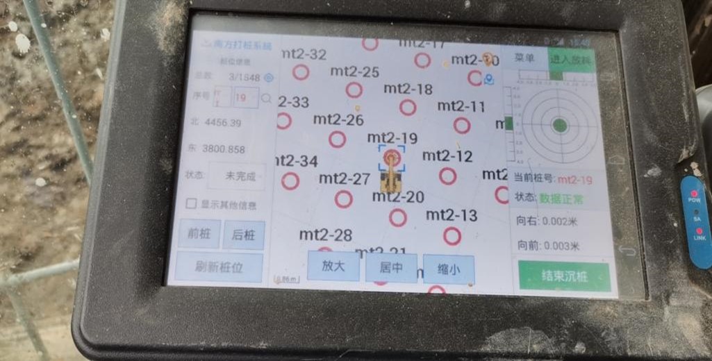 本工程自2021年2月21日開工,2022年3月21日完工,總歷時375天。2021年5月進入施工高峰期,使用旋挖鉆機9臺,每日完成樁數約 70根。由于測放樁位的工作量大,采用全站儀測放效率較低,影響施工進度,經研究引進了智能打樁系統。在引進智能打樁系統后,先與全站儀測放的樁位進行對比測試,對其測放樁位的精度和效率進行了驗證,滿足精度要求,并在項目實施過程中及時總結使用經驗,為進一步推廣智能化打樁系統的應用打好基礎。本工程在鋼筋籠制作方面,采用了3臺滾籠機進行箍筋纏繞工作,提高了工作效率并減少了人員投入,保證了施工進度需要。