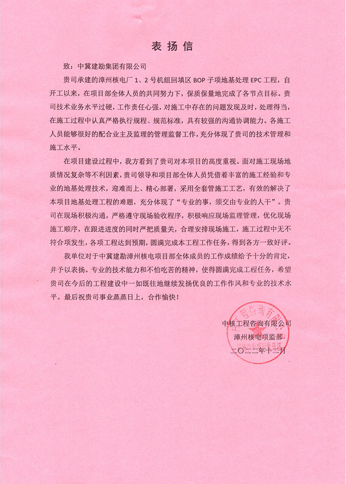 漳州核電一期工程是我國“華龍一號”批量化首個建設項目,承載著“華龍騰飛,中國自主三代核電技術從并跑到領跑”的戰略使命,核電基地為“雙碳”目標實現作出顯著貢獻,是國家核電建設的重點項目。在工程建設過程中面對規模較大、場地分散、交叉施工等多項不利因素,項目部迎難而上、精心部署、晝夜施工,確保安全、質量的情況下按期完成了各項任務。項目部在谷習光同志的帶領下,在管理和服務上充分發揮自身優勢,積極爭當所有參見單位的標桿,得到了甲方和監理的高度贊揚,為以后更多的合作奠定了堅實基礎。