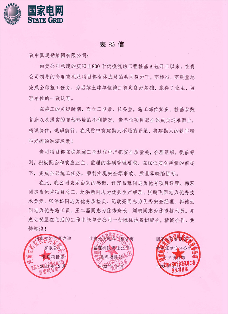 公司收到了國家電網(wǎng)慶陽±800千伏換流站工程由業(yè)主國家電網(wǎng)和監(jiān)理單位河南立新及甘肅光明的聯(lián)合表揚信,表揚信中說在我公司領(lǐng)導(dǎo)的高度重視及項目部全體成員的共同努力下,高標(biāo)準(zhǔn)、高質(zhì)量地完成施工任務(wù),為后續(xù)土建單位施工奠定良好基礎(chǔ),贏得了業(yè)主、監(jiān)理單位的一致認(rèn)可。在施工的關(guān)鍵時期,我單位項目部全體成員迎難而上,精誠協(xié)作,砥礪前行,在風(fēng)雪中有建勘人不屈的脊梁,將建勘人的鐵軍精神發(fā)揮的淋漓盡致!