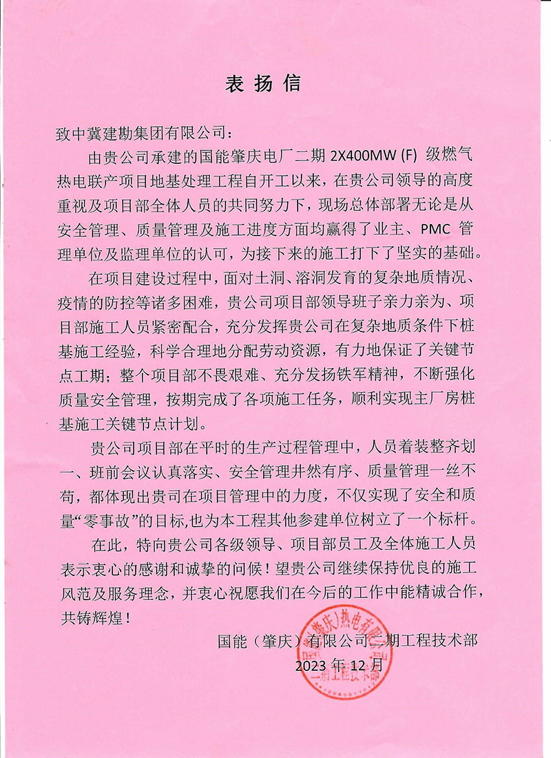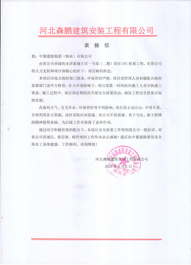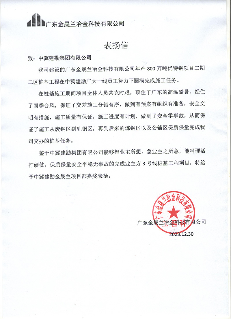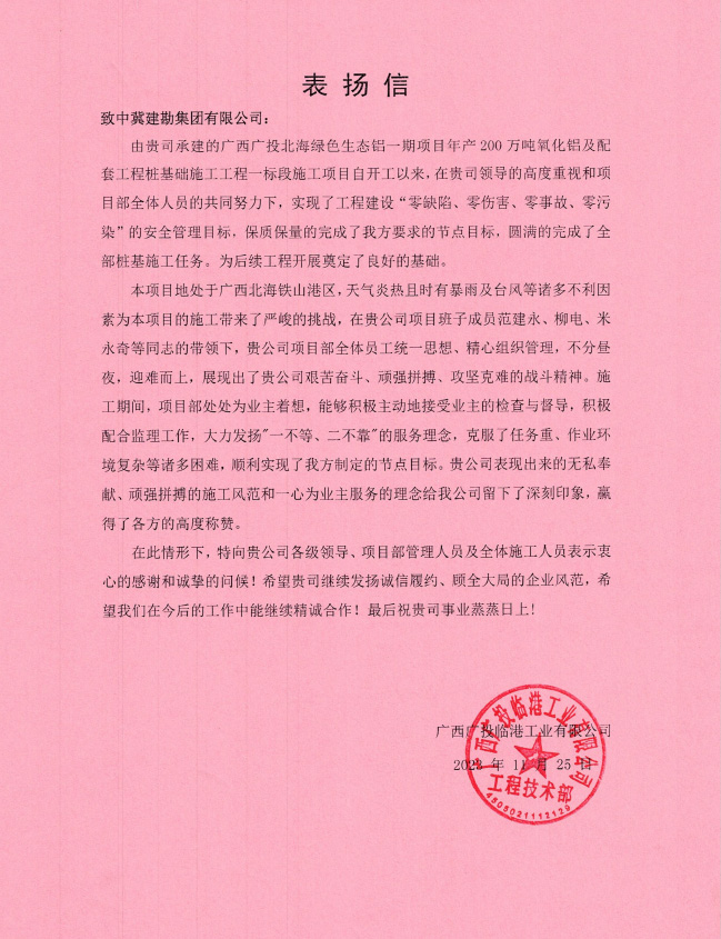 廣西北海氧化鋁項目樁基工程工程自2023年2月24日開工,至12月15日完成合同內(nèi)全部樁基施工任務(wù),在此期間,項目部全體成員一直堅持安全第一的理念,實現(xiàn)了工程建設(shè)“零缺陷、零傷害、零事故、零污染”的安全管理目標(biāo),施工過程中克服種種困難,順利實現(xiàn)了業(yè)主方制定的節(jié)點目標(biāo),獲得業(yè)主單位的肯定與褒獎,送出表揚信,為主要管理人員頒發(fā)獎狀。為后續(xù)施工工作的開展提供了可靠保障,贏得了業(yè)主及相關(guān)各方的認(rèn)可。