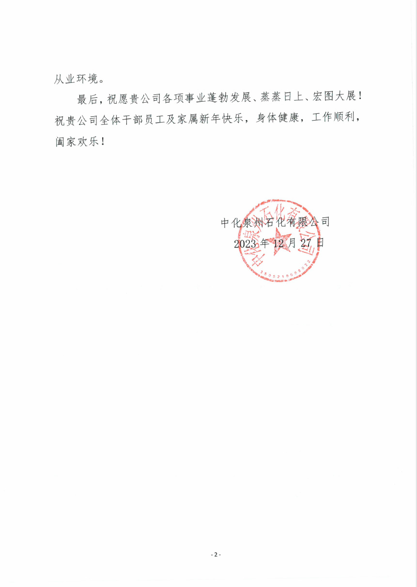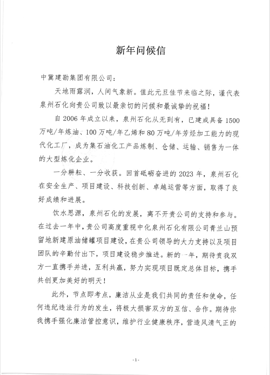 中化泉州石化有限公司為我公司發(fā)來了新年問候信,信中中化泉州石化有限公司肯定了我公司對中化泉州石化有限公司青蘭山預(yù)留地新建原油儲罐項目建設(shè)的重視;看到了我公司及項目施工人員為項目的辛勤付出;并期望在新的一年里加強(qiáng)合作,再創(chuàng)新業(yè)績。