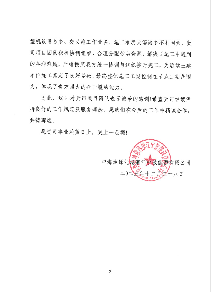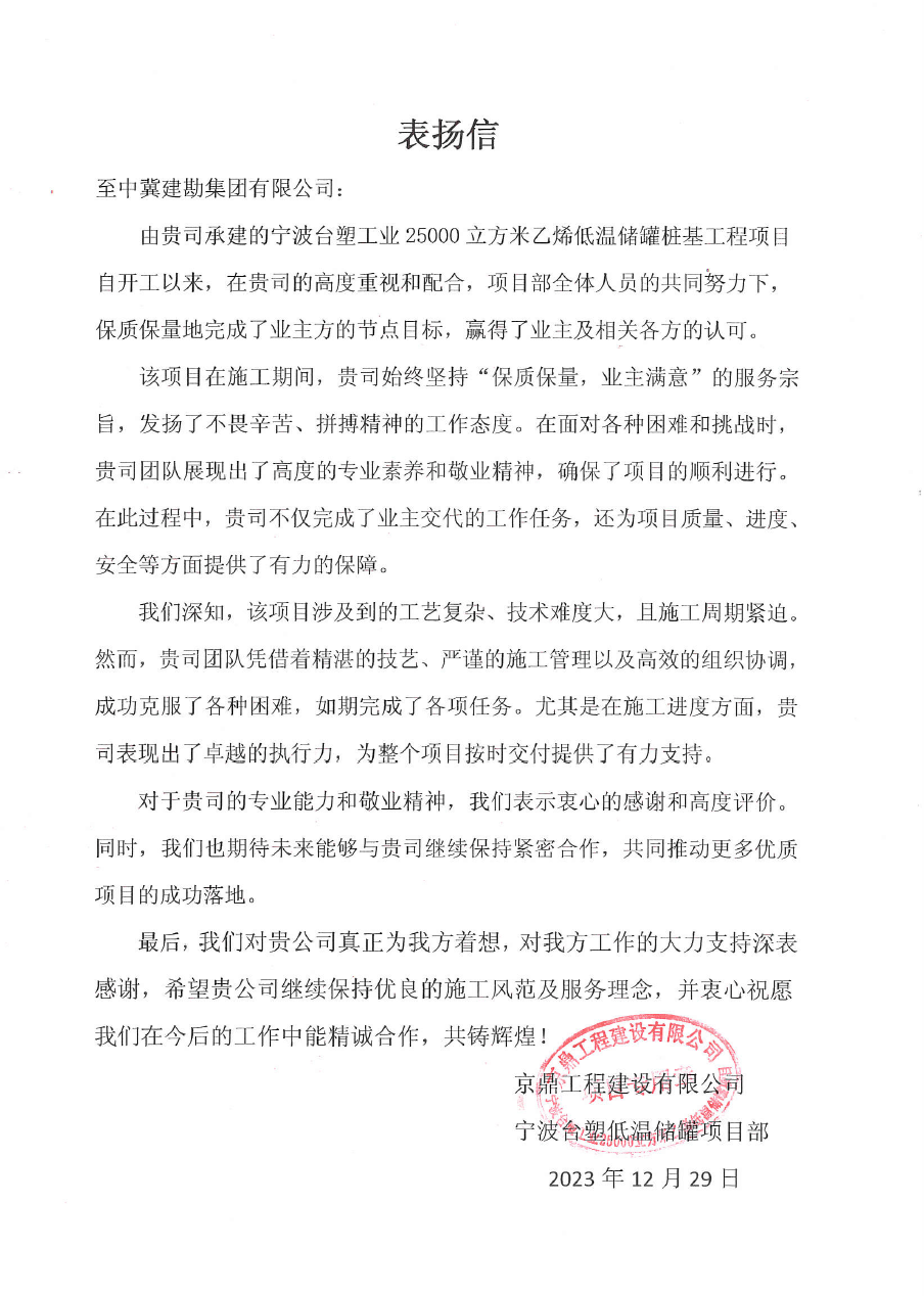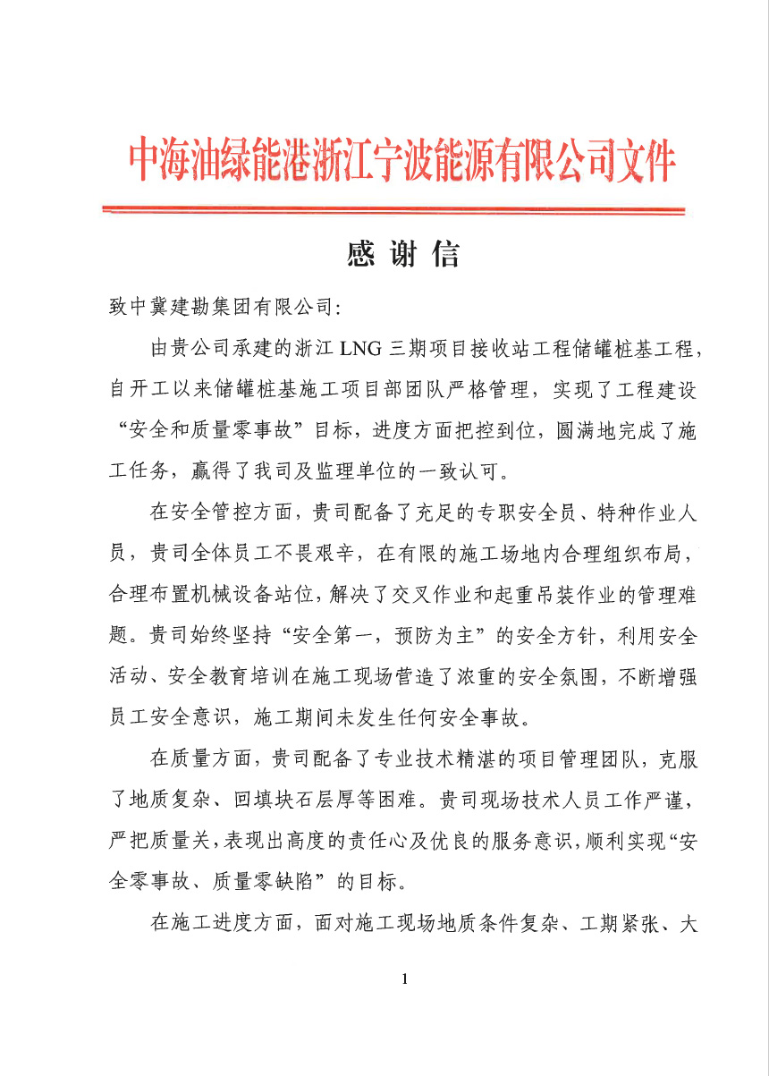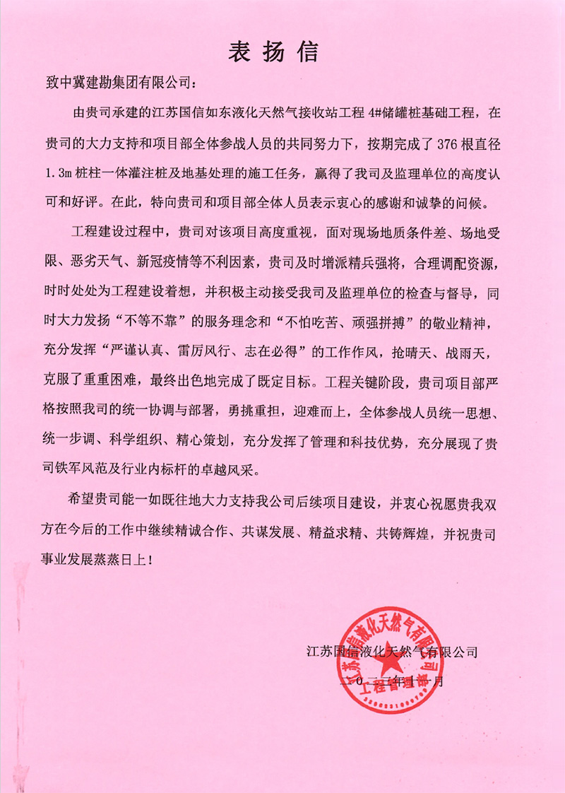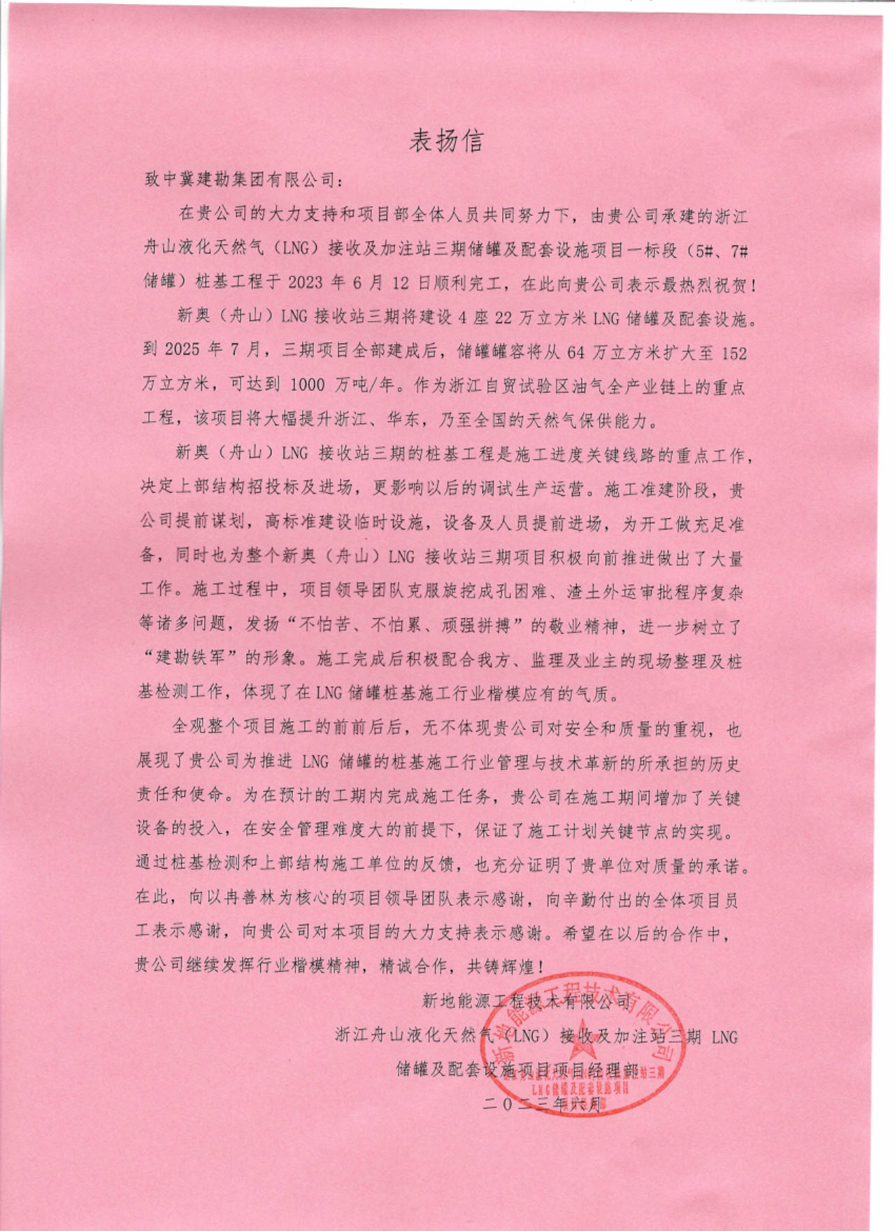 浙江舟山液化天然氣(LNG)接收及加注站三期LNG儲罐及配套設(shè)施項目(5#、7#儲罐樁基工程)于2023年6月25日收到新地能源工程技術(shù)有限公司發(fā)來的表揚信。自開工以來,在公司的大力支持和項目部全體員工的共同努力下,精心組織、全力布局,克服了前期施工任務(wù)重等諸多困難,安全、高效、優(yōu)質(zhì)的完成了儲罐的樁基施工任務(wù),有力保障了本項目總體工期計劃,贏得了監(jiān)理單位和業(yè)主單位的一致認(rèn)可和好評。