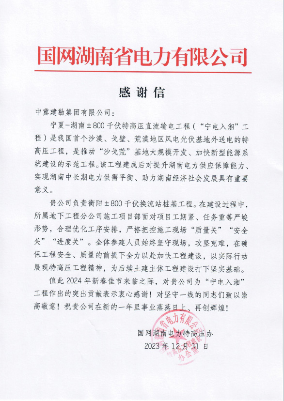 國家電網(wǎng)湖南電力特高壓辦,為我公司承建的衡陽±800千伏換流站工程樁基項目部發(fā)來感謝信一封。感謝信內(nèi)容主要表達(dá)了,面對項目的工期緊,任務(wù)重等關(guān)鍵形勢,稱贊我公司能嚴(yán)格把質(zhì)量關(guān),安全關(guān)和進(jìn)度關(guān)。