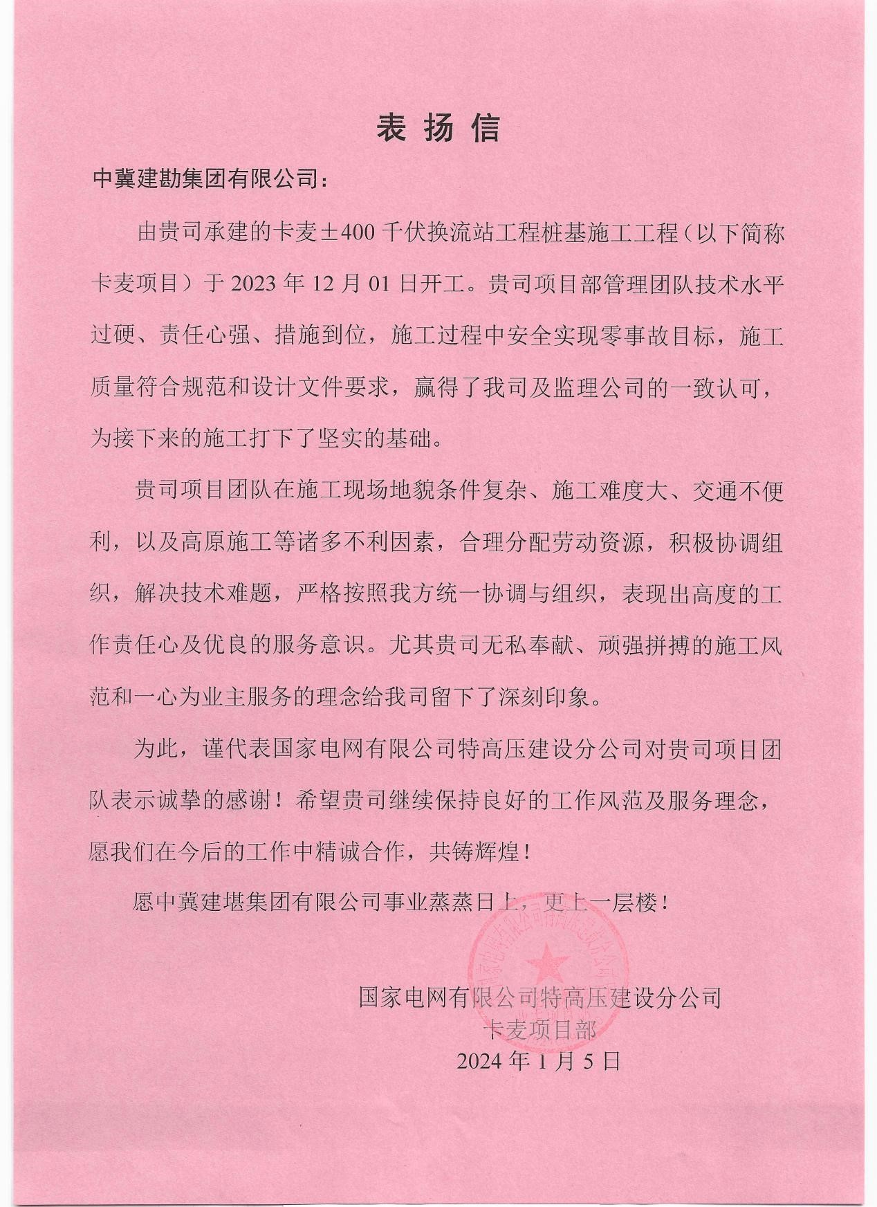 卡麥±400千伏換流站工程樁基施工工程收到業(yè)主國家電網(wǎng)有限公司特高壓建設(shè)分公司發(fā)來的表揚信。項目部敢打硬仗的精神面貌,贏得了業(yè)主方的高度贊賞和認(rèn)可。