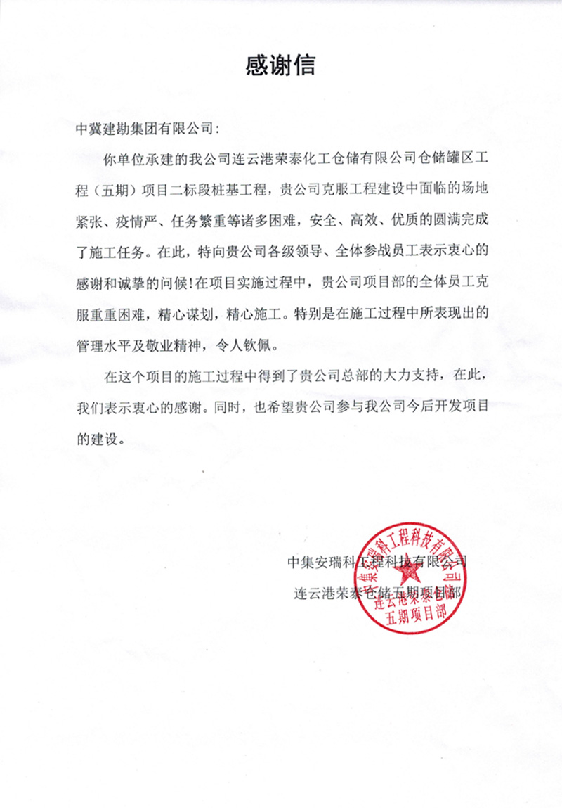 連云港榮泰化工倉儲有限公司倉儲罐區(qū)工程(五期)項目二標(biāo)段樁基工程,業(yè)主在表揚信中說:貴公司克服工程建設(shè)中面臨的場地緊張、疫情嚴(yán)、任務(wù)繁重等諸多困難,安全、高效、優(yōu)質(zhì)的圓滿完成了施工任務(wù)。貴公司項目部全體員工克服重重困難,精心謀劃,精心施工。特別是在施工中所表現(xiàn)出的管理水平及敬業(yè)精神,令人欽佩。
