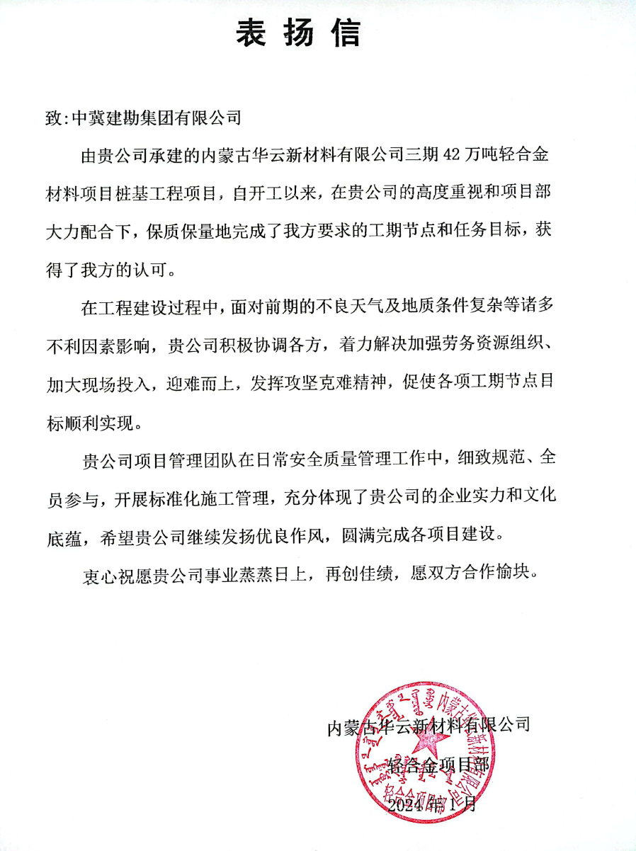 內(nèi)蒙古華云新材料有限公司三期42萬噸輕合金材料項目樁基工程,在工程建設(shè)過程中,面對前期的不良天氣及地質(zhì)條件復(fù)雜等諸多不利因素影響,積極協(xié)調(diào)各方,著力解決加強(qiáng)勞務(wù)資源組織、加大現(xiàn)場投入,迎難而上,發(fā)揮攻堅克難精神,保質(zhì)保量地完成了工期節(jié)點和任務(wù)目標(biāo),獲得甲方的認(rèn)可。