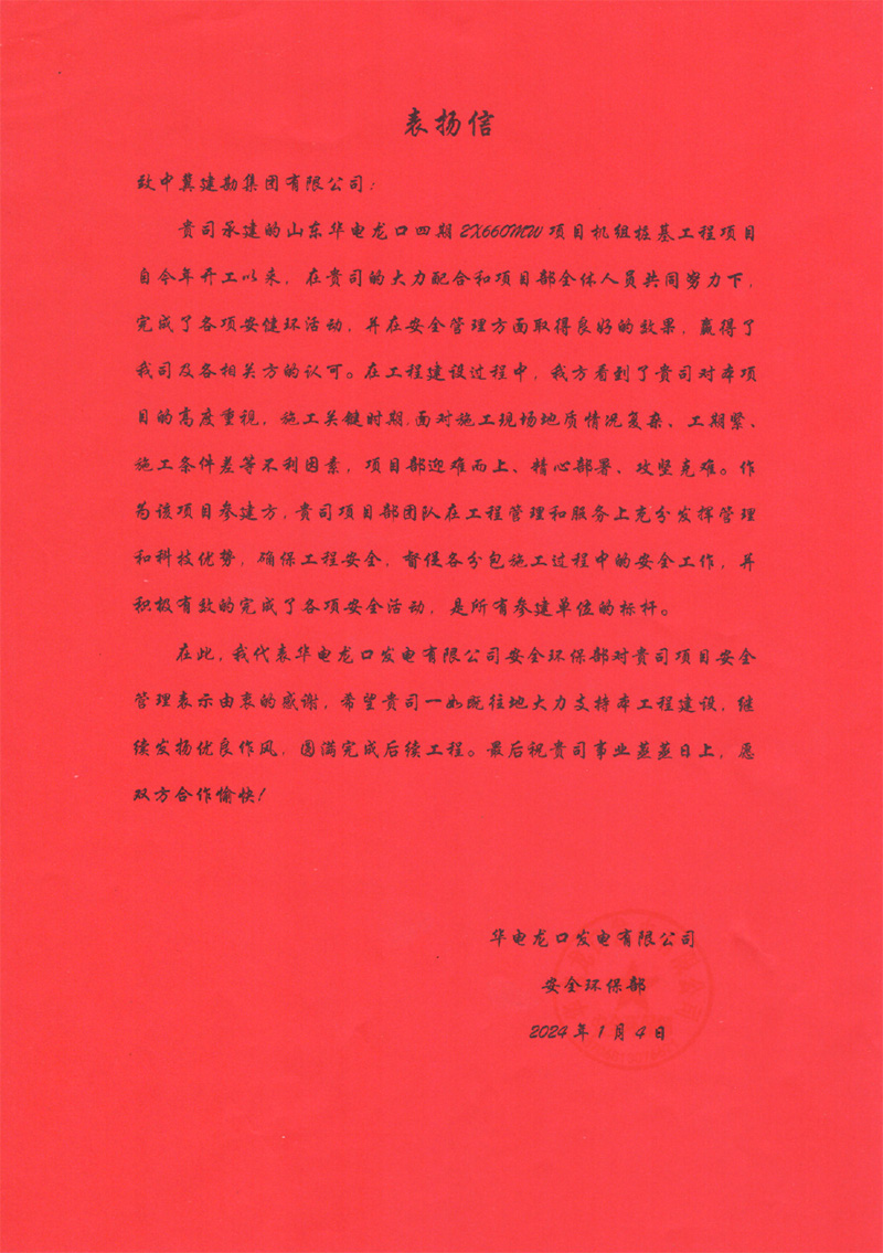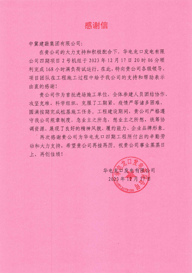 華電龍口發(fā)電有限公司四期項目2號機(jī)組于2023年12月17日20時04分順利完成168小時滿負(fù)荷試運行。工程建設(shè)期間,完成了各項安健環(huán)活動,并在安全管理方面取得良好的效果,贏得了業(yè)主方認(rèn)可。我公司人員嚴(yán)格遵守我公司規(guī)章制度,急業(yè)主之所急,想業(yè)主之所想,統(tǒng)籌協(xié)調(diào)資源,展現(xiàn)了良好的精神風(fēng)貌、履約能力、企業(yè)品牌形象。為此,業(yè)主特向我公司各級領(lǐng)導(dǎo)、項目團(tuán)隊在工程施工過程中給予的支持和幫助表示由衷感謝。