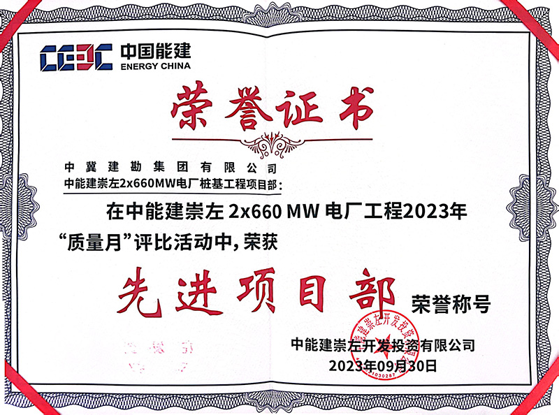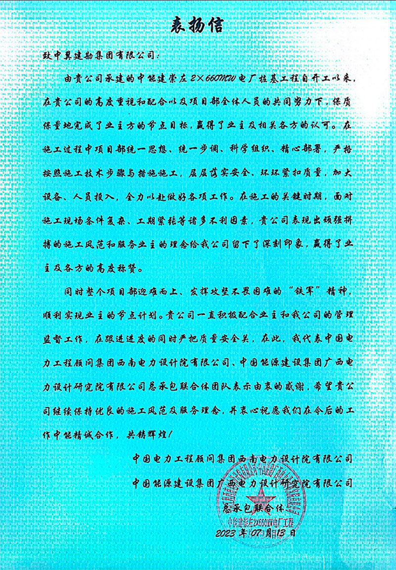 中能建崇左2×660MW電廠樁基工程,在施工過程中,項目部統(tǒng)一思想、統(tǒng)一步調(diào)、科學(xué)組織,精心部署,嚴(yán)格按照施工技術(shù)步驟與措施施工,層層落實安全,環(huán)環(huán)緊扣質(zhì)量,加大設(shè)備、人員投入,全力以赴做好各項工作。全體員工以頑強(qiáng)拼搏的施工風(fēng)范和服務(wù)業(yè)主的理念給我公司留下了深刻印象,贏得了業(yè)主及各方的高度稱贊。