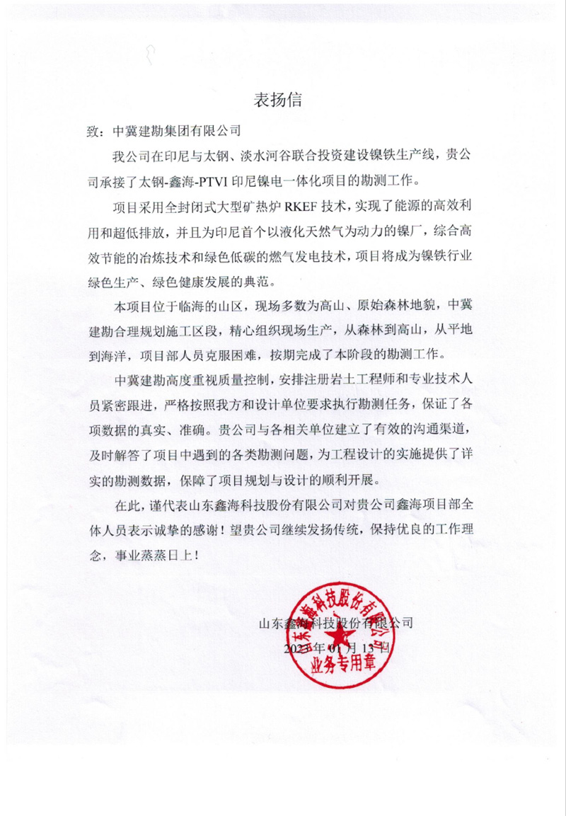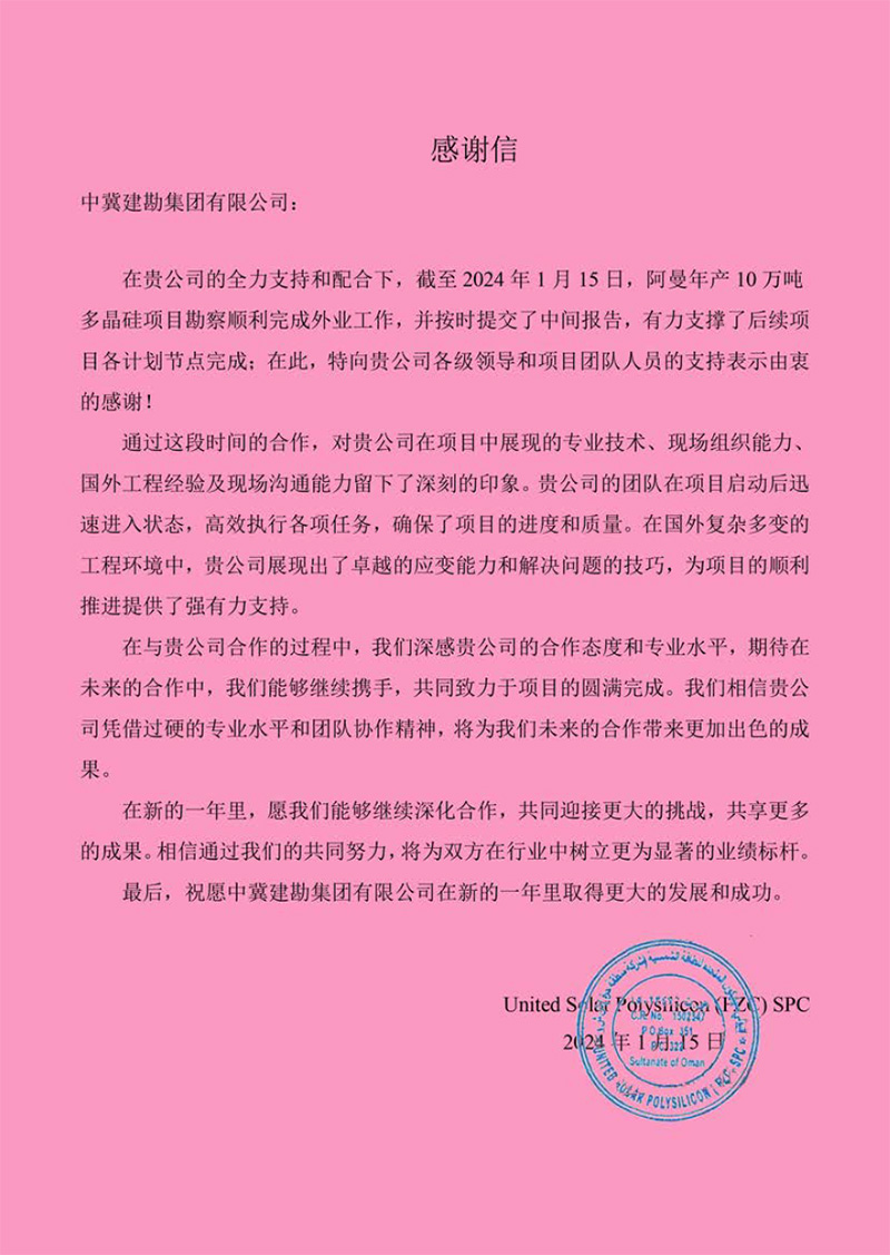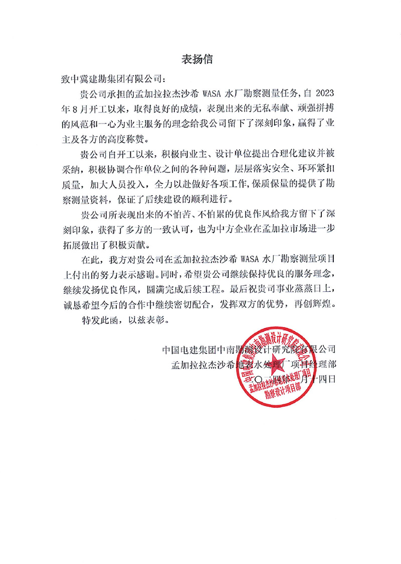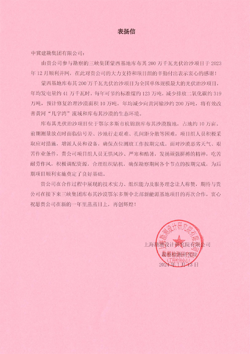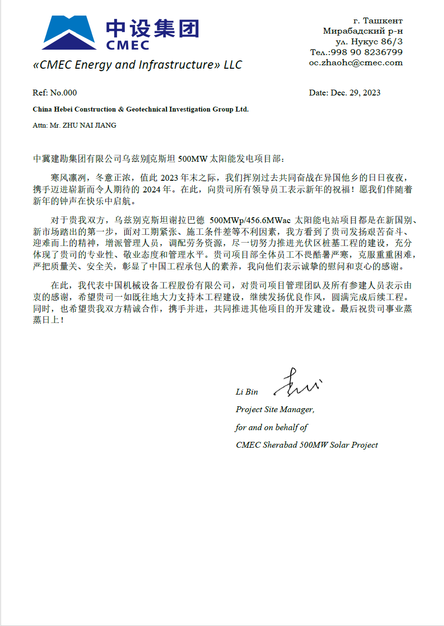 中國機(jī)械設(shè)備工程股份有限公司發(fā)來的表揚(yáng)信,對在烏茲別克斯坦謝拉巴德 500MWp/456.6MWac 太陽能電站項目建設(shè)過程中,項目全體人員克服諸多不利因素,發(fā)揚(yáng)建勘精神,盡一切努力推進(jìn)工程建設(shè),以及公司的專業(yè)性、敬業(yè)態(tài)度和管理水平給予了高度評價。同時,對項目管理團(tuán)隊及所有參建人員表示由衷的感謝,并希望雙方精誠合作,攜手并進(jìn),共同推進(jìn)其他項目的開發(fā)建設(shè)。