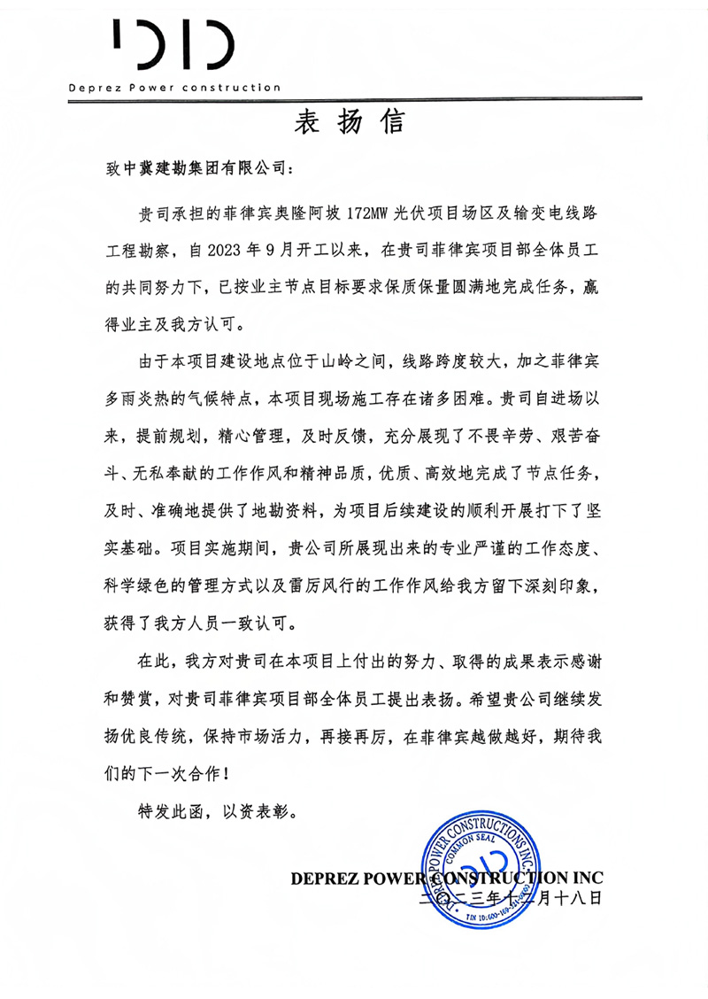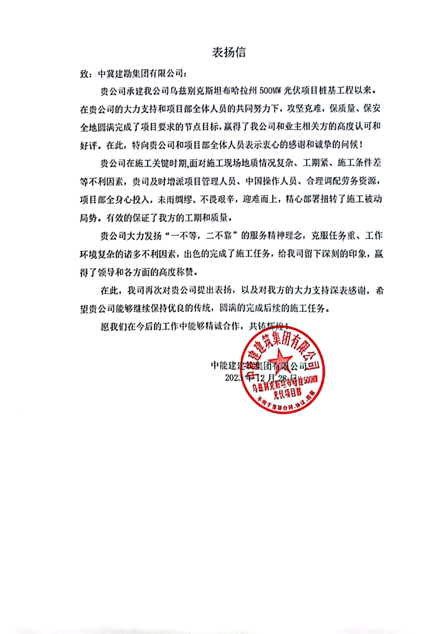 中能建建筑集團(tuán)有限公司發(fā)來的表揚(yáng)信,對在烏茲別克斯坦布哈拉州500MW光伏項目建設(shè)過程中,項目部全體人員發(fā)揚(yáng)“一不等,二不靠”的服務(wù)理念,克服工作環(huán)境和地質(zhì)復(fù)雜等困難,在公司的大力支持和項目全體人員的共同努力下,圓滿完成了項目要求的節(jié)點(diǎn)目標(biāo),特向我公司表示衷心的感謝和誠摯的問候,愿今后繼續(xù)精誠合作,共鑄輝煌。
