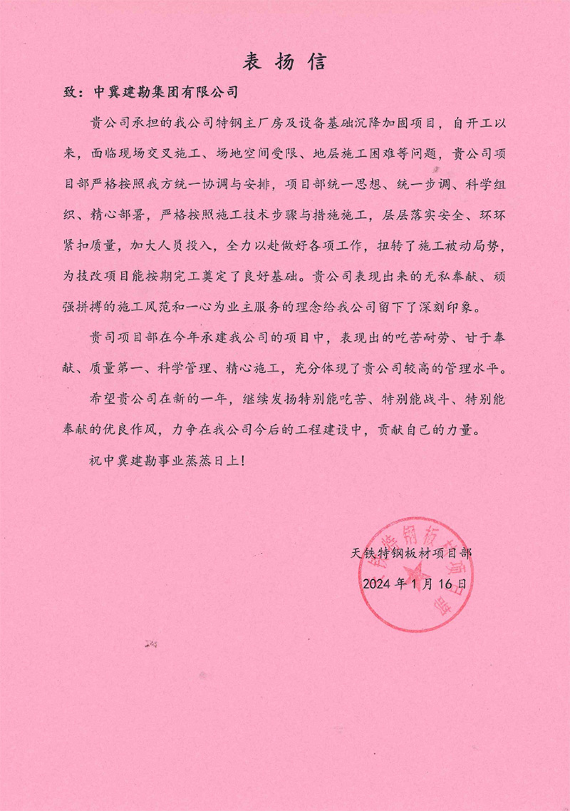 近日,集團(tuán)公司陸續(xù)收到國內(nèi)外項目業(yè)主發(fā)來的表揚(yáng)信,信中對我公司的項目管理、團(tuán)隊建設(shè)、安全文明施工、技術(shù)質(zhì)量管控等,給予了高度評價,同時送上了新年一年的祝福。