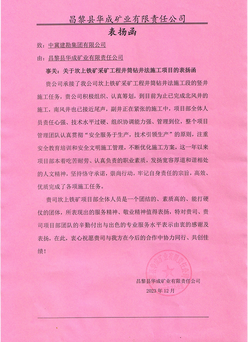昌黎縣華成礦業(yè)有限責(zé)任公司發(fā)來的表揚(yáng)函,對我公司在坎上鐵礦采礦工程井筒鉆進(jìn)法施工項目施工過程中,積極組織,認(rèn)真籌劃,以及項目部全體人員責(zé)任心強(qiáng)、技術(shù)水平過硬、組織協(xié)調(diào)能力強(qiáng)、管理到位,認(rèn)真貫徹“安全服務(wù)于生產(chǎn),技術(shù)引領(lǐng)生產(chǎn)”的原則,不斷優(yōu)化施工方案,已順利完成北風(fēng)井的施工,南風(fēng)井也即將完成,表示由衷的感謝和表揚(yáng),希望今后合作中協(xié)力同行、共創(chuàng)佳績。