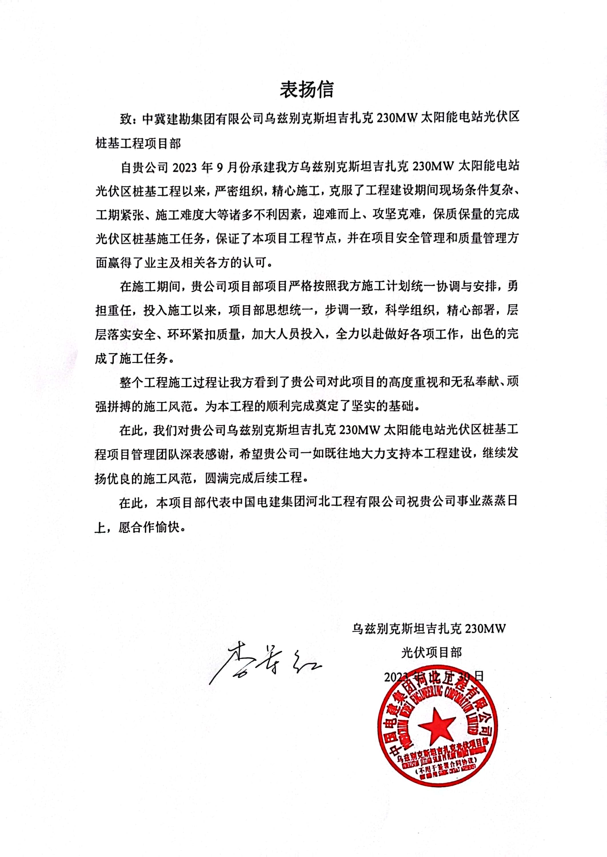 中國電建集團(tuán)河北工程有限公司發(fā)來的表揚(yáng)信,對在烏茲別克斯坦吉扎克230MW太陽能電站光伏項目施工期間,項目部思想統(tǒng)一,科學(xué)組織,精心部署,層層落實(shí)安全、環(huán)環(huán)緊扣質(zhì)量,全力以赴做好各項工作的奮斗精神,給予了高度評價和感謝。