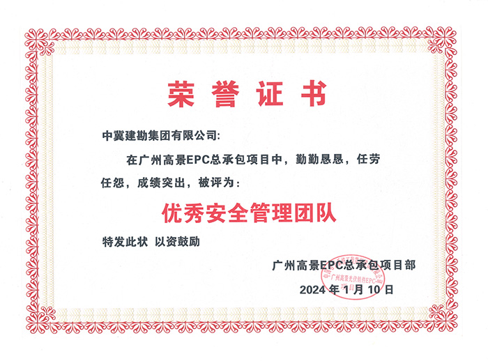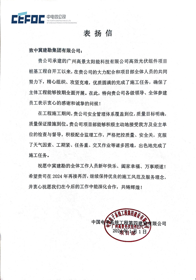 中國電子系統(tǒng)工程第四建設(shè)有限公司發(fā)來的表揚(yáng)信,對我公司在廣州高景太陽能科技有限公司高效光伏組件項目建設(shè)過程中,公司的大力配合和項目部全體人員的共同努力下,安全管理體系覆蓋到位,質(zhì)量保證措施到位,嚴(yán)格把控質(zhì)量、安全關(guān),出色完成了施工任務(wù),特向我公司各級領(lǐng)導(dǎo)、全體參建員工表示衷心的感謝,并授予“優(yōu)秀安全管理團(tuán)隊”和“優(yōu)秀資料包商”榮譽(yù)。