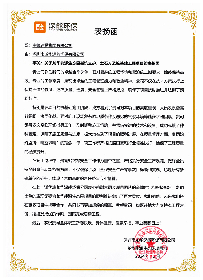 2024年12月20日,深圳市龍華深能環(huán)保有限公司發(fā)來表揚信,對我公司正在施工的龍華能源生態(tài)源基坑支護、土石方及樁基礎(chǔ)工程項目在施工過程中,面對復(fù)雜的工程環(huán)境和緊迫的工期要求,始終保持高效、專業(yè)的工作態(tài)度,展現(xiàn)出卓越的工程管理能力和敬業(yè)精神,在技術(shù)方案執(zhí)行上嚴(yán)謹(jǐn)?shù)淖黠L(fēng),質(zhì)量、進度、安全管理上嚴(yán)格的把控,以及我公司領(lǐng)導(dǎo)多次親臨現(xiàn)場指導(dǎo)工作,確保了項目按時推進并達到了預(yù)期標(biāo)準(zhǔn),表示了衷心的感謝,并表達了未來將有更多的項目攜手合作。