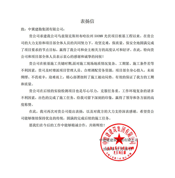 2024年12月20日,中能建建筑集團有限公司發(fā)來表揚信,對我公司施工的烏茲別克斯坦布哈拉州500MW光伏項目樁基工程及實驗檢測項目施工過程中,未雨綢繆,攻堅克難,合理調(diào)配人員和設(shè)備資源,克服了各種不利因素,保證了工程和質(zhì)量,出色的完成了施工任務(wù),贏得了領(lǐng)導(dǎo)和項目參建單位的高度稱贊,給予了表揚,并表示愿今后的工作中能夠繼續(xù)精誠合作。