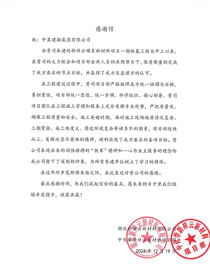 2024年12月19日,湖北新祥云新材料有限公司發(fā)來感謝信,對我公司正在施工的新祥云磷系新材料項目一期樁基工程在施工過程中,嚴(yán)格按照業(yè)主統(tǒng)一協(xié)調(diào)和安排,勇?lián)負?dān),面對地質(zhì)情況復(fù)雜、工期緊張、施工難度大等諸多不利因素,項目部迎難而上,發(fā)揮功堅克難的精神,順利完成了各項目標(biāo)。對項目部表現(xiàn)出來的頑強拼搏的“鐵軍”精神和一心為業(yè)主服務(wù)的理念給予了表揚,特在年終歲尾之際發(fā)來感謝信。