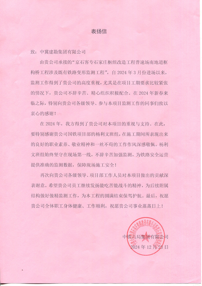 近期,集團公司陸續收到中國鐵路北京局集團有限公司、中鐵六局集團有限公司、新疆兵準信弘能源有限責任公司、任丘市供水有限公司發來的感謝信、表揚信以及優秀合作單位榮譽獎牌、先進工作者榮譽證書。