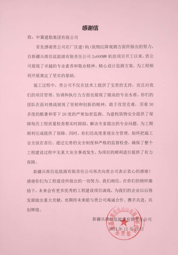 新疆昌吉兵準信泓能源2x600MW機組沉降觀測項目,新疆項目部職工不畏嚴寒酷暑,頂著30多度的酷暑和零下20多度的極冷天氣加密監測,為廠區建構筑物安全提供了數據保障,每次工程質量檢查都實時跟蹤,解決專家提出的專業問題,為工期順利完成提供了保障。業主單位特發來感謝信深表感謝!