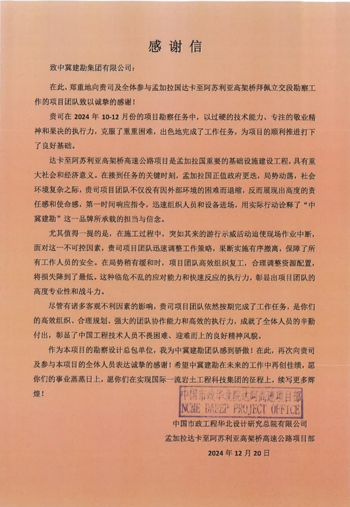 孟加拉達卡至阿蘇利亞高架橋高速公路項目部向我公司發來了感謝信,感謝我公司在項目勘察期間展現的高度專業精神和卓越執行力。尤其在復雜的社會環境和突如其來的示威活動中,我公司項目團隊臨危不亂,迅速調整工作策略,保障了項目的順利推進和人員的安全。
