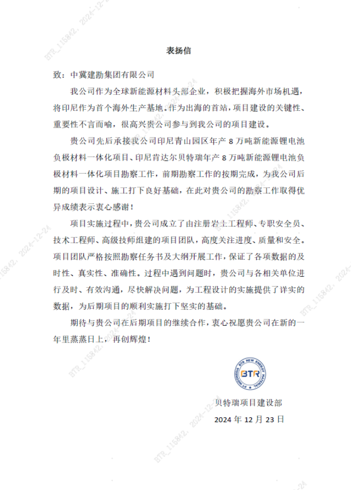 近日,公司收到了來自多方業主單位的感謝信及表揚信,表彰公司在孟加拉、印尼、沙特及國內多個重要項目中,展現出的卓越項目管理能力、技術實力、團隊協作及不懈努力。各業主單位對公司在工程勘察、施工管理、技術方案執行、質量控制和安全生產等方面給予了較高認可,并送上了誠摯的祝福。