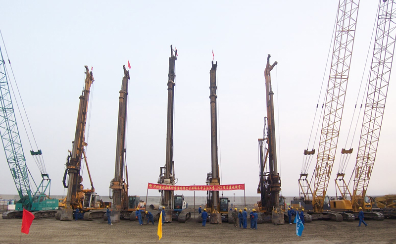 我公司完成三岔雙向擠擴(kuò)旋挖鉆孔灌注樁,樁徑1.4m,每根樁三個(gè)盤(pán)徑2.4m的承力盤(pán),混凝土等級(jí)C40,共720根樁,并完成了樁端后壓漿、鑿樁頭及地面接樁工作,共計(jì)70695m³混凝土;振動(dòng)沉管碎石樁4416根;碎石墊層25794 m3;混凝土地坪施工12766m2。
